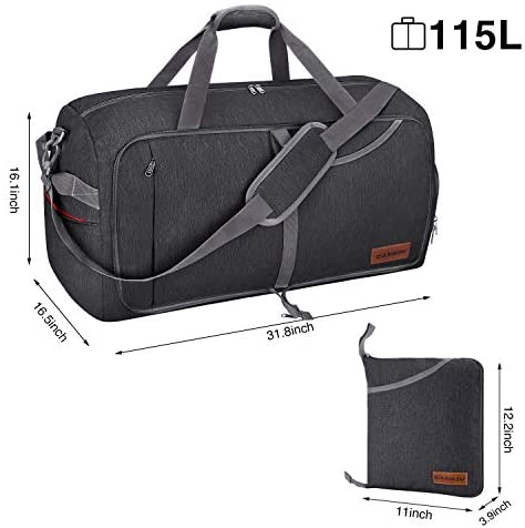 LARGE FOLDABLE DUFFLE: It extends to 31.8 x 16.5 x 16.1 inch with 115 Liters capacity and 2.07 pounds. Folded Size:11 x 12.2 x 3.9 inch, easy to store. This duffle bag has one spacious main compartment and 6 separate pockets.Keep your belongings well organized.