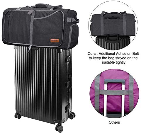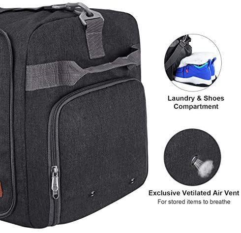 GOTTA LOVE BONUSES: 1.) Side shoe pocket has two exclusive ventilated air vents and can also be used as a dirty laundry compartment, water & odor resistant. 2.) The sleeve on the back of the duffle has an additional adhesion belt to keep the bag stayed on the suitcase tightly. 3.) It comes with rounded stitched grip handles and padded, adjustable, removable shoulder strap buckle