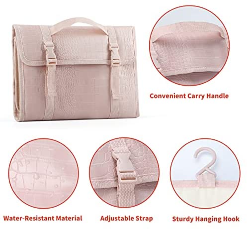 Rempry hanging travel toiltetry bag make your travel comfortably to have all your necessities in one bag. Our travel toiletry bag is compact and lightweight, but it still has over eleven mesh pockets to meet your different requests. It folds up nicely and will be a breeze to carry while travelling. Specification: Measurements: 12.4 x 9 x 0.6 inches (rolled), 12.4 x 29.5 inches (open). Color: Crocodile Pink Weight: 280 grams (0.62 pounds) Material: Waterproof PU leather with crocodile pattern outer, mesh pocket inner, metal zippers, metal hook for hanging.