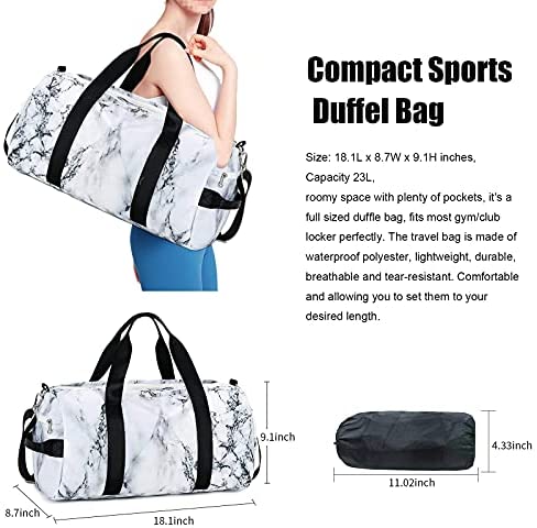 Small duffle bag Size:18.1 L x 8.7 W x 9.1 H Inch, Capacity 23L, ideal carry-on size for airplane luggage or overnight weekender trips. You can carry it as a small travel bag, overnight duffle, weekender tote for shortime trips.