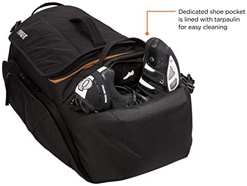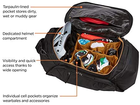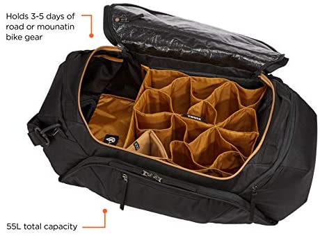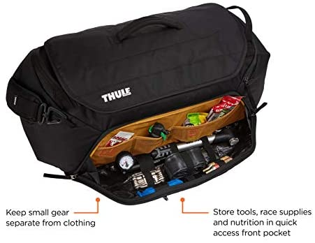 The Thule RoundTrip Bike Duffel is the ultimate bike gear locker for dedicated cyclists. Designed with structured organization, mountain bikers and road bikers alike are able to keep a bag packed and ready with every last piece of gear. Simply swap out fresh wearables while keeping the bag in the trunk of your vehicle to easily access at the trailhead. Purpose-built storage includes individual cell pockets for coordinating kits, jackets and accessories. A dedicated helmet compartment comfortably fits any size road or trail helmet. Tarpaulin lined zippered pockets store shoes and dirty clothing to protect clean clothing from wet or muddy gear. The cycling gear bag is built for quick access with a structured design and wide opening for high visibility and efficient access to all gear. A front pocket keeps nutrition and tools separate from other gear. This race day bag also includes a removable shoulder strap makes it easy to transport from car to hotel or around the race venue.